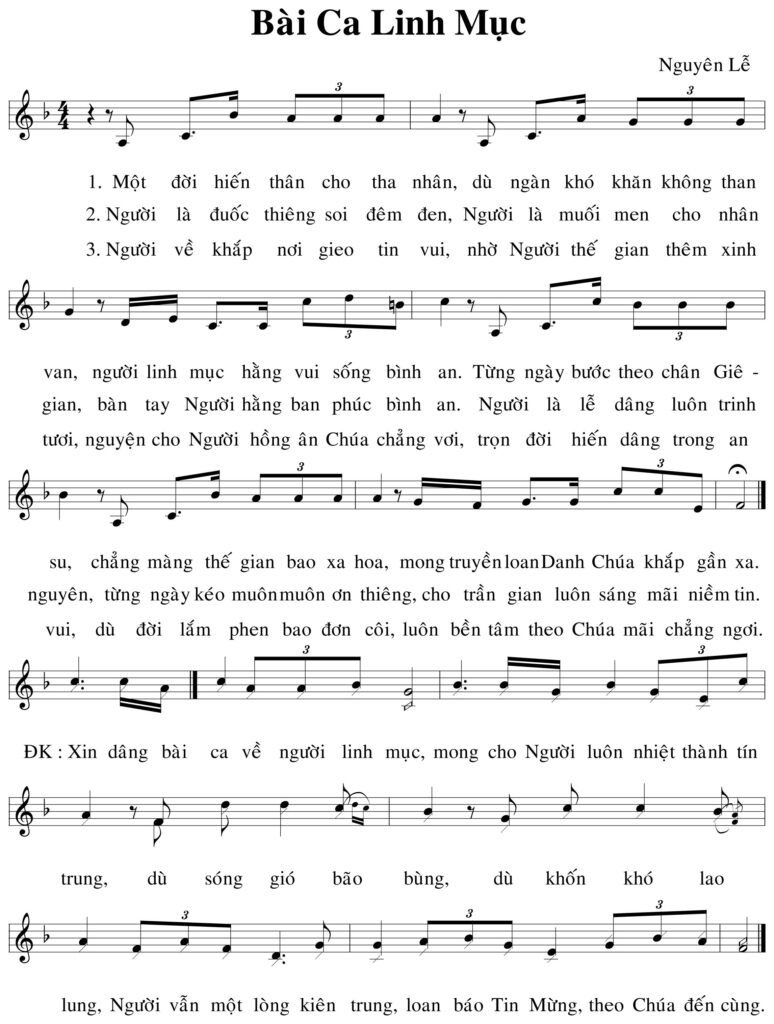 Xin dâng bài ca về người linh mục, mon cho Người luôn nhiệt thành tín trung, dù sóng gió bão bùng, dù khốn khó lao lung, Người vẫn một lòng kiên trung, loan báo Tin Mừng, theo Chúa đến cùng.
