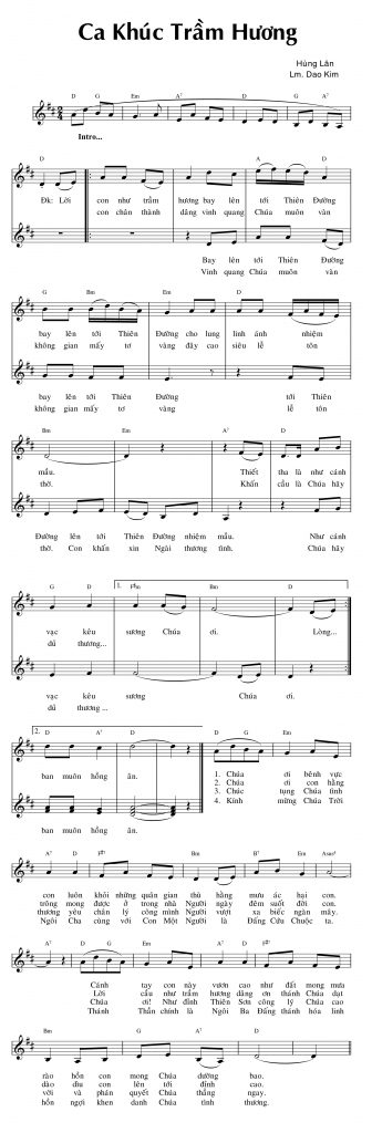 Lời con như trầm hương bay lên tới Thiên Đường bay lên tới Thiên Đường cho lung linh ánh nhiệm mầu. Thiết tha là như cánh vạc kêu sương Chúa ơi. Lòng con chân thành dâng vinh quang Chúa muôn vàn không gian mấy tơ vàng đây cao siêu lễ tôn thờ. Khấn cầu là Chúa hãy dủ thương ban muôn hồng ân.
