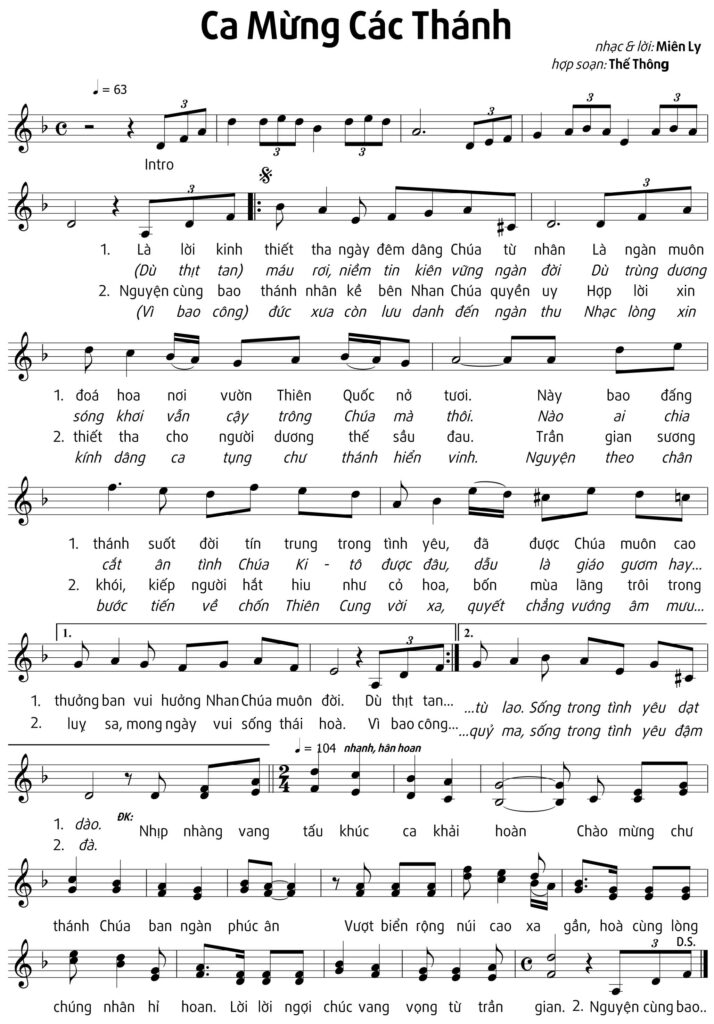 2/ Nguyện cùng bao thánh nhân kề bên Nhan Chúa quyền uy Hợp lời xin thiết tha cho người dương thế sầu đau. Trần gian sương khói, kiếp người hắt hiu như cỏ hoa, bốn mùa lãng trôi trong luy sa, mong ngày vui sống thái hòa. Vì bao công đức xưa còn lưu danh đến ngàn thu Nhạc lòng xin kính dâng ca tungj chư thánh hiển vinh. Nguyện theo chân bước tiến về chốn Thiên Cung vời xa, quyết chẳng vướng âm mưu quỷ ma, sống trong tình yêu đậm đà.