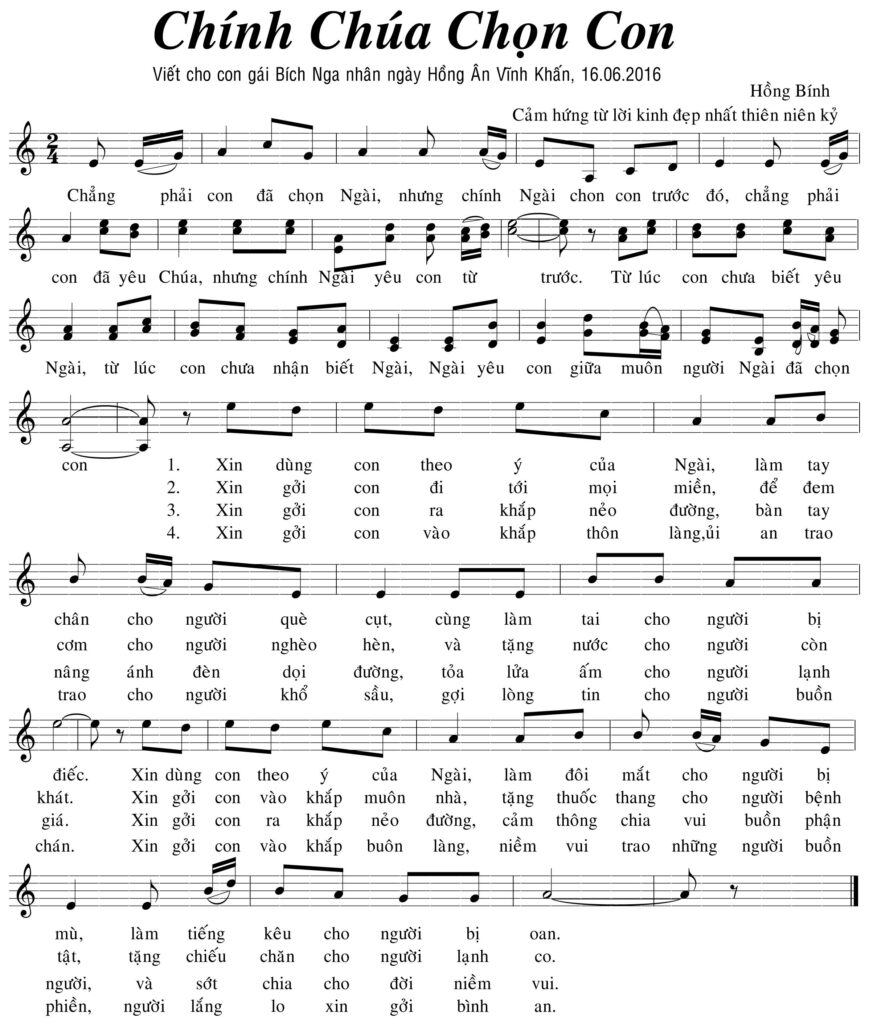 Ca khúc Chính Chúa Chọn Con được sáng tác bởi một người mẹ dành cho con gái nhân ngày Hồng Ân Vĩnh Khấn. Người mẹ đó là Hồng Bích, và bản được giới thiệu được thể hiện bởi Hà Thanh Xuân. thanhcavn.com xin giới thiệu ca khúc Chính Chúa Chọn Con pdf, mp3 và lời bài hát.