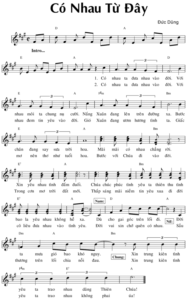 1. Có nhau ta đưa nhau vào đời. Với nhau môi ta chung nụ cười. Nắng Xuân đang lên trên đường xa. Bước chân đang say sưa trời hoa. Mãi mãi có nhau chẳng rời. Xin yêu nhau tình đắm đuối. Chúa chúc phúc tình yêu ta thiên thu tình bao la yêu nhau không hề xa. Nam: Dù cho gai góc trên lối đi. Nữ: Đời ta mưa gió bao khó nghuy. Chung: Xin trung kiên tình yêu ta trao nhau dâng Thiên Chúa!