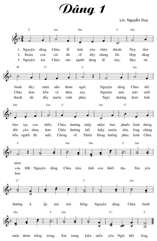 Nguyện dâng Chúa tâm tình con thiết tha. Xin yêu thương ủ ấp trái tim hồng. Nguyện dâng Chúa bánh rượu thơm trắng trong. Xin trung kiên mến yêu Ngài hết lòng.