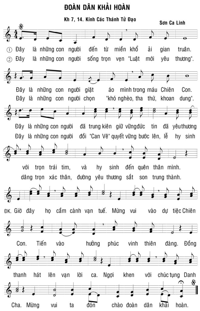 Ca khúc Đoàn Dân Khải Hoàn được sáng tác bởi Sơn Ca Linh, được thể hiện bởi Ca đoàn Sao Mai, thuộc mục Các Thánh Tử Đạo. Thanhcavn.com xin giới thiệu ca khúc Đoàn Dân Khải Hoàn PDF, mp3 và lời bài hát.