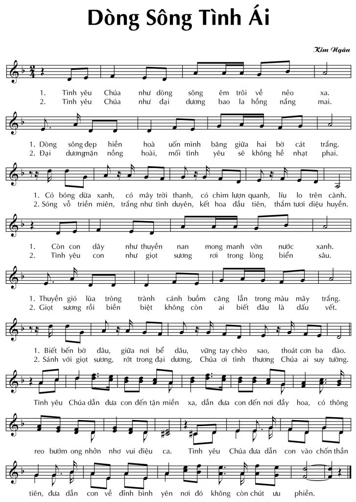 1/ Tình yêu Chúa như dòng sông êm trôi về nẻo xa. Dòng sông đẹp hiền hòa uốn mình băng giữa hai bờ cát trắng. Có bóng dừa xanh, có mây trời thanh, có chim lượn quanh, líu lo trên cành. Còn con đây như thuyền nan mong manh vờn nước xanh. Thuyền gió lùa tròng trành cánh buồn căng lẫn trong màu mây trắng. Biết bến bờ đâu, giữa nơi bể dâu, vững tay chèo sao, thoát cơn ba đào.