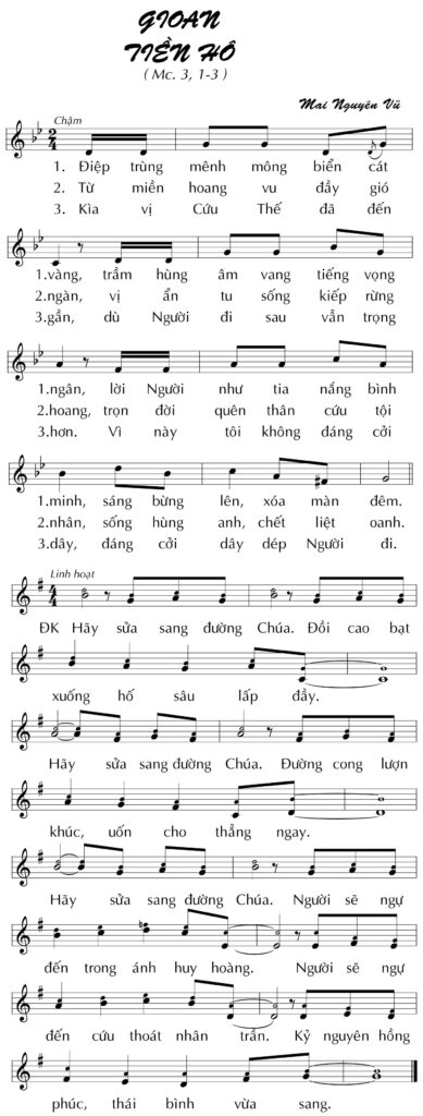 Hãy sửa sang đường Chúa. Đồi cao bạt xuống hố sâu lấp đầy. Hãy sửa sang đường Chúa. Đường con lượn khúc, uôns cho thẳng ngay. Hãy sửa sang đường Chúa. Người sẽ ngự đến trong ánh huy hoàng. Người sẽ ngự đến cứu thoát nhân trần. Kỷ nguyên hồng phúc, thái bình vừa sang.