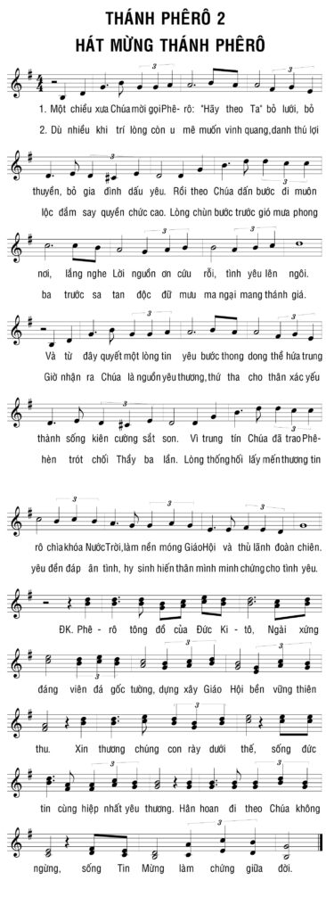 Phêrô tông đồ của Đức Kitô, Ngài xứng đáng viên đá gốc tường, dựng xây Giáo Hội bền vững thiên thu. Xin thương chúng con rày dưới thế, sống đức tin cùng hiệp nhất yêu thương. Hân hoan đi theo Chúa không ngừng. sống Tin Mừng làm chứng giữa đơì.