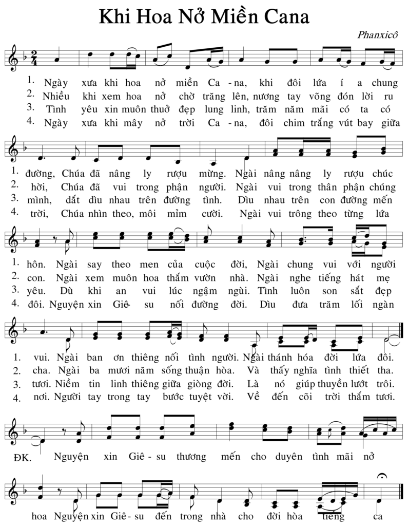 - Ngày xưa khi hoa nở miền Cana, khi đôi lứa í a chung đường. Chúa đã nâng ly rượu mừng. Ngài nâng nâng ly rượu chúc hôn. Ngài say theo men của cuộc đời, Ngài chung vui với người vui. Ngài ban ơn thiêng nối tình người. Ngài thánh hóa đời lứa đôi.