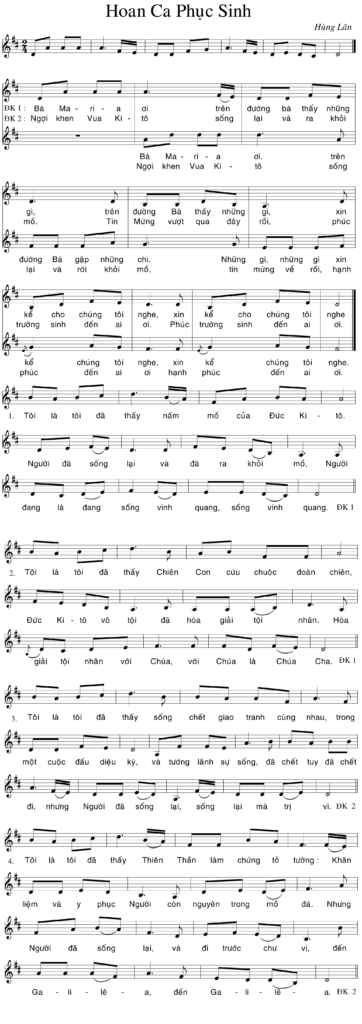 Ca khúc Hoan ca Phục Sinh được sáng tác bởi Nghệ Sĩ Hùng Lân, ca khúc hồi tưởng lại việc bà Maria Mácđala ra viếng mộ Đức Giê-su, và đã được Thiên Thần cho biết Đức Giê-su đã sống lại và đi đến Galilê. Bên cạnh đó bài hát cũng cho chúng ta ý thức về cái chết của Đức Kitô.