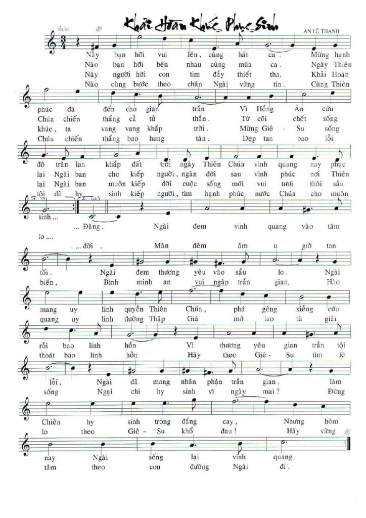 Bài hát Khải Hoàn Khúc Phục Sinh được thể hiện bởi ca sĩ Phi Nguyễn, được sáng tác nhạc và lời by An Lê Thanh, thuộc Album Tuyển tập các ca khúc Mùa Phục Sinh, có kèm file PDF sheet nhạc.