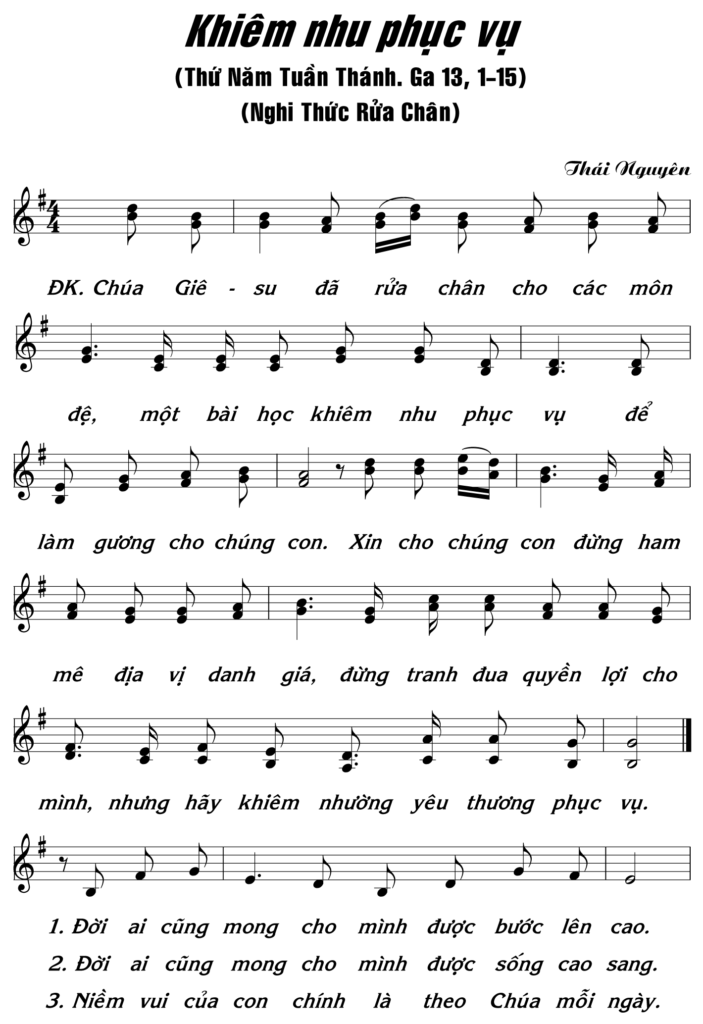 ĐK. Chúa Giê-su đã rửa chân cho các môn đệ, một bài học khiêm nhu phục vụ để làm gương cho chúng con. Xin cho chúng con đừng ham mê điaj vị danh giá, đừng tranh đua quyền lợi cho mình, nhưng hãy khiêm nhường yêu thương phục vụ.