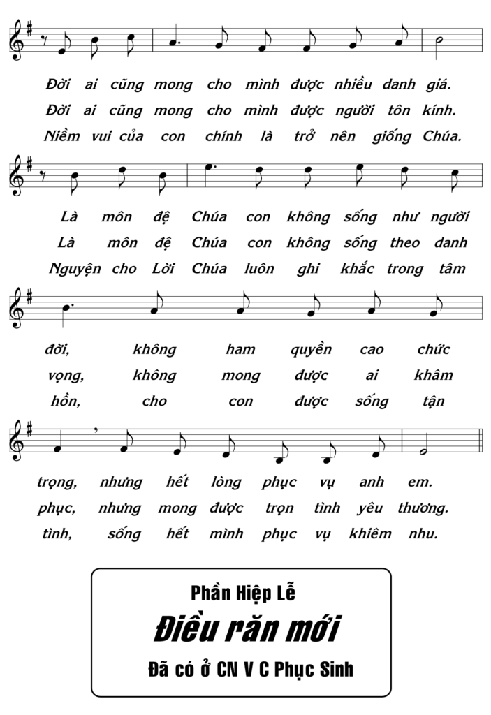 - Đời ai cũng mong cho mình được sống cao sang. Đời ai cũng mong cho mình được người tôn kính. Là môn đệ Chúa con không sống theo danh vọn, không mong được ai khâm phục, nhưng mong được trọn tình yêu thương.