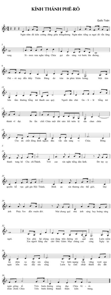 Ngàn năm đã kiên cường đứng giữa trùng dương. Ngàn năm tiếng ca ngợi đã vẫn lừng vang Simon xưa nghe tiếng Chúa gọi sẵn sàng vui bước lên đường. Phêrô nay đến thấy Thiên Đàng dư tràn ân phúc khôn lường. Một tâm hồn tầm thường bỗng trở thành cao quý. Người dân chài Galilê bỗng trở thành vĩ đại. Ba lần chối Chúa một đời sám hối tuôn lệ sầu chan chứa. Cho dù chết đóng đinh ngược đầu vẫn sẵn sàng vì Chúa. Đồng thanh tung hô Cha chí Thánh. Trời cao xin nghe tiêng dân lành. Dơ tay uy quyền hỗ vực giữ gìn Hội Thánh. Bình an xin thương cho thế giới. Dọi ánh Phúc Âm đến muôn đời. Mai chung quê nhà ánh sáng huy hoàng sáng ngời.