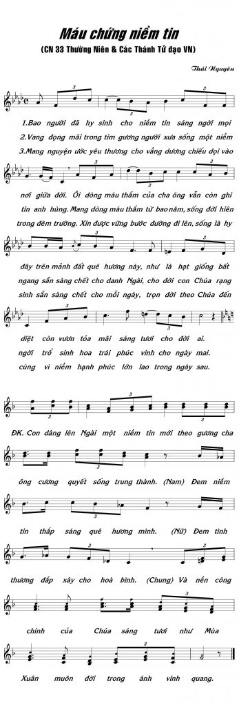 Ca khúc Máu Chứng Niềm Tin được sáng tác bởi Linh mục Thái Nguyên và được thể hiện bởi Trung Hiếu. thanhcavn.com giới thiệu ca khúc Máu Chứng Niềm Tin pdf, mp3 và lyrics.