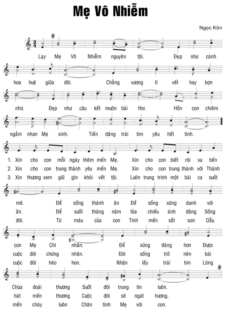 Lạy Mẹ Vô Nhiễm nguyên tội. Đẹp như cánh hoa huệ giữa đời. Chẳng vương tì vết hay bợn nhơ. Đẹp như câu kết muôn baì thơ. Hồn con chiêm ngắm nhan Mẹ xinh. Tiến dâng trái tim yêu hết tình.