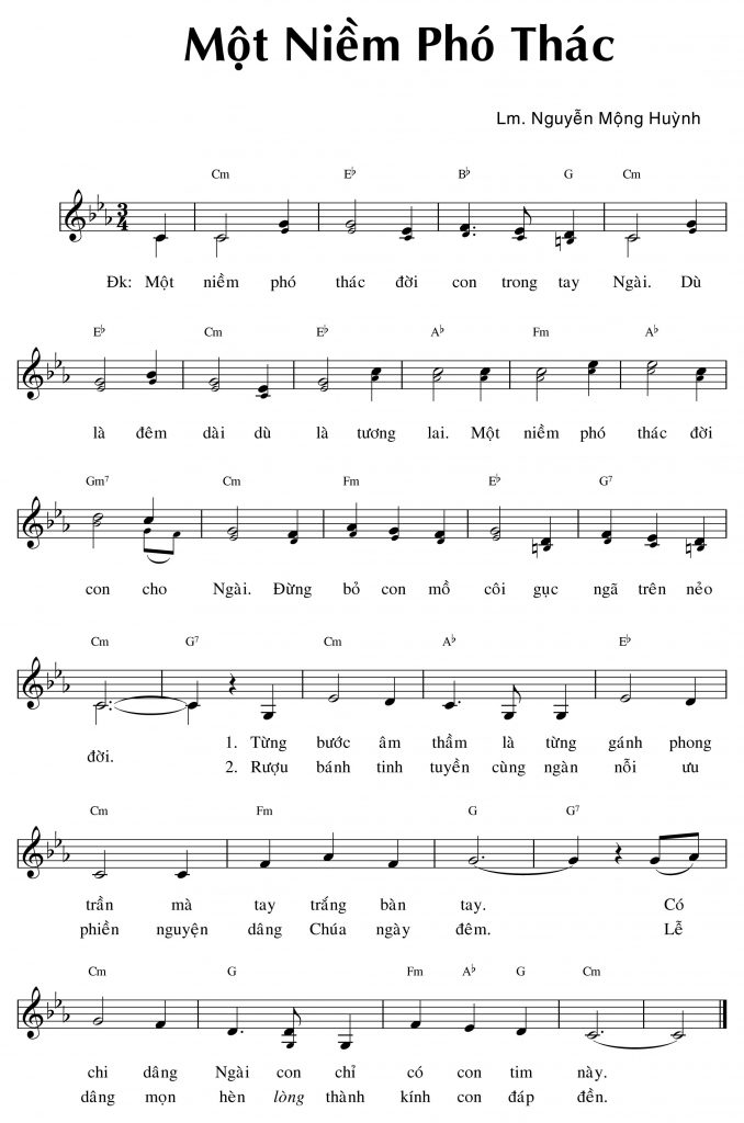 Bài hát Một niềm phó thác được sáng tác bởi Linh mục Nguyễn Mộng Huỳnh, được thể hiện Hạnh Nguyên và nhóm Mèo Ướt. Thanhcavn.com xin giới thiệu ca khúc Một niềm phó thác Pdf, mp3 và lyrics lời bài hát.