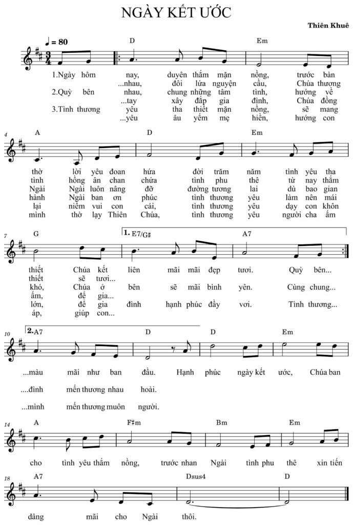 Bài hát Ngày kết ước thuộc chuyên mục Lễ Cưới, ca khúc được sáng tác bởi Thiên Khuê, được thể hiện bởi Diệu Linh và Anh Vinh. Thanhcavn.com xin đính kèm file MP3 cùng PDF Sheet nhạc.