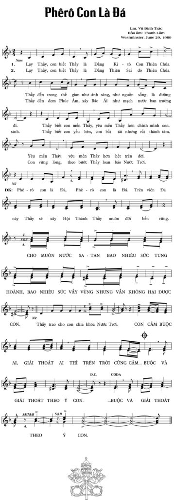 Phêrô con là Đá, Phêrô con là Đá. Trên viên Đá này Thầy sẽ xây Hội Thánh Thầy muôn đời bền vững. Cho muôn nước satan bao nhiêu sức tung hoành, bao nhiêu sức vẫy vùng nhưng vẫn không hại được con. Thầy trao cho con chìa khóa Nước Trời. Con cầm buộc ai, giải thoát ai thì trên trời cũng cầm buộc và giải thoát theo ý con.