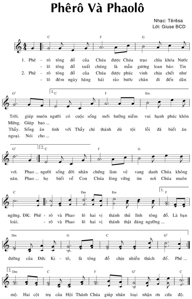 Phêrô và Phaolô hai vị thánh thủ lĩnh tông đồ. Là bạn đường của Đức Ki tô, là tông đồ chịu nhiều thách đố, Phê rô và Phaolô hai vị thánh thật đáng ngưỡng mô. Hai cột trụ của Hội Thánh Chúa giúp nhân loại nhận ơn cứu độ.