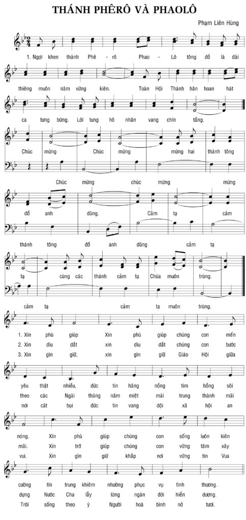 Ngợi khen thánh Phêrô Phaolô tông đồ là đài thiêng muôn năm vững kiên. Toàn Hội Thánh hân hoan hát ca tưng bưngf. Lời tung hô nhân vang chín tầng. Chúc mừng Chúc mừng mừng hai thánh tông đồ anh dũng. Cảm tạ cảm tạ cùng các thánh cảm tạ Chúa muôn trùng.
