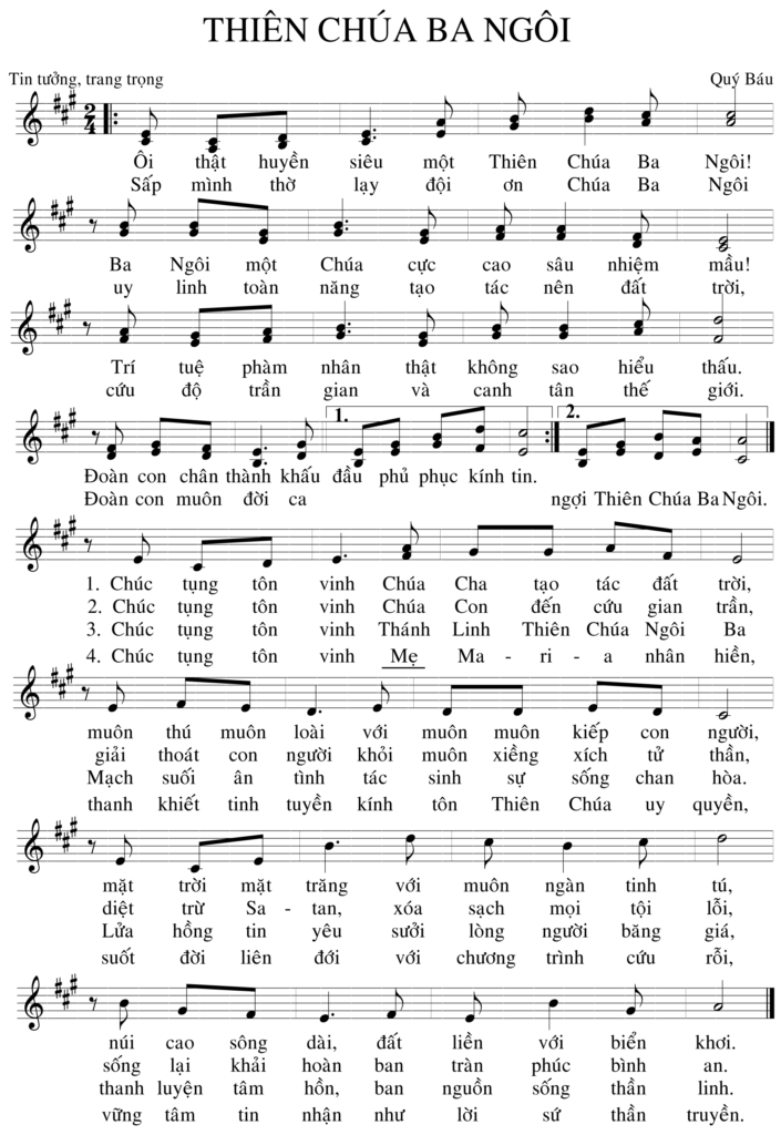 Ôi thật huyền siêu một Thiên Chúa Ba Ngôi! Ba Ngôi một Chúa cực cao sâu nhiệm mầu! Trí tuệ phàm nhân thật không sao hiểu thấu. Đoàn con chân thành khấu đầu phủ phục kính tin. Sấp mình thờ lạy đôị ơn Chúa Ba Ngôi uy linh toàn năng tạo tác nên đất trời, cứu độ trần gian và canh tân thế giới. Đoàn con muôn đời ca ngợi Thiên Chúa Ba Ngôi.