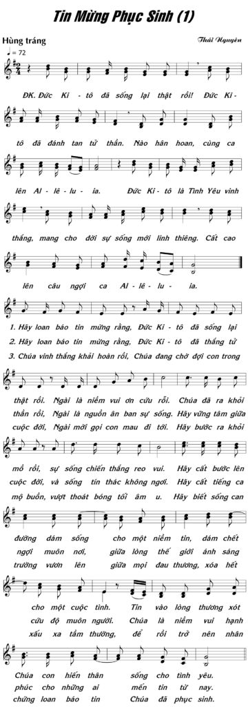 - Hãy loan báo tin mừng rằng, Đức Ki-tô đã thắng tử thần rồi, Ngài là nguồn ân ban sự sống. Hãy vững tâm giữa cuộc đời, và sống tín thác không ngơi. hãy cất tiếng ca ngợi muôn nơi, giữa lòng thế giới ánh sáng cứu độ muôn người. Chúa là niềm vui hạnh phúc cho những ai mến tin từ nay.