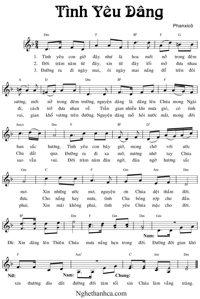 Ca khúc Tình yêu dâng được sáng tác bởi Phanxicô, được thể hiện bởi Phi Nguyễn và Mai Hậu. thanhcavn.com xin giới thiệu ca khúc Tình yêu dâng Pdf, Mp3 và lời bài hát Lyrics.