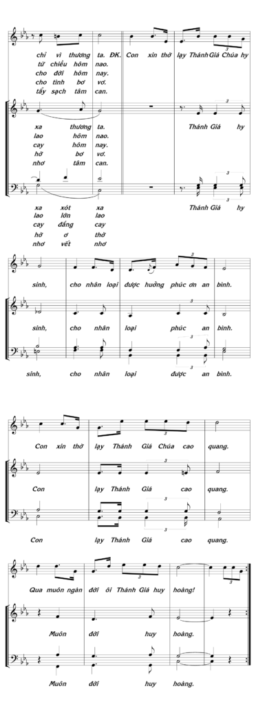 ĐK. Con xin thờ lạy Thánh Gía Chúa hy sinh, cho nhân loại được hưởng phúc ơn an bình. Con xin thờ lạy Thánh Gía Chúa cao quang. Qua muôn ngàn đời ôi Thánh Gía huy hoàng!
