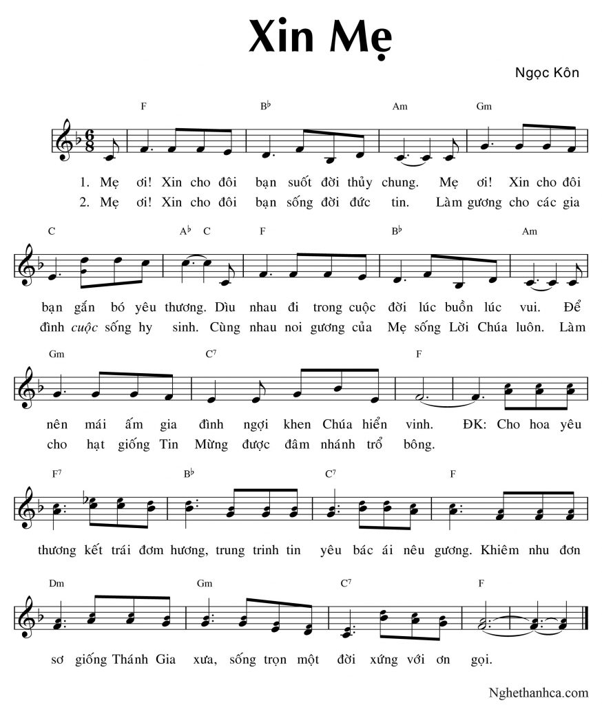 Ca khúc Xin Mẹ được sáng tác bởi Ngọc Kôn, được thể hiện bởi Linh mục Nguyễn Sang. Nhanhcavn.com xin giới thiệu ca khúc Xin Mẹ Pdf, Mp3 và lời bài hát Lyrics.